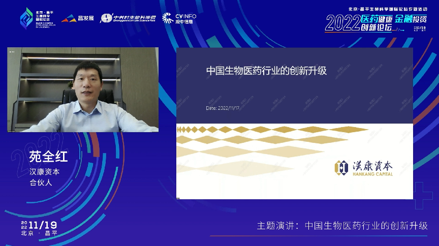11月19日,由北京市昌平區(qū)人民政府主辦,北京中關(guān)村生命科學(xué)園管理委員會(huì)、北京市昌平區(qū)金融服務(wù)辦公室、昌發(fā)展、中關(guān)村生命科學(xué)園和投中信息承辦的“2022北京·昌平生命科學(xué)國(guó)際論壇專題活動(dòng)之醫(yī)療健康金融投資創(chuàng)新論壇”在線上舉辦,論壇盛邀頭部投資機(jī)構(gòu)、生命科學(xué)領(lǐng)域領(lǐng)軍人物、優(yōu)秀創(chuàng)新創(chuàng)業(yè)企業(yè)代表、媒體記者等齊聚一堂,共同探討后疫情時(shí)代下全球醫(yī)療健康產(chǎn)業(yè)的未來(lái)趨勢(shì),探索新格局背景下中國(guó)醫(yī)療健康產(chǎn)業(yè)創(chuàng)新發(fā)展的新機(jī)遇和新挑戰(zhàn)。會(huì)上,漢康資本合伙人苑全紅發(fā)表了題為“中國(guó)生物醫(yī)藥行業(yè)的創(chuàng)新升級(jí)”的主題演講。