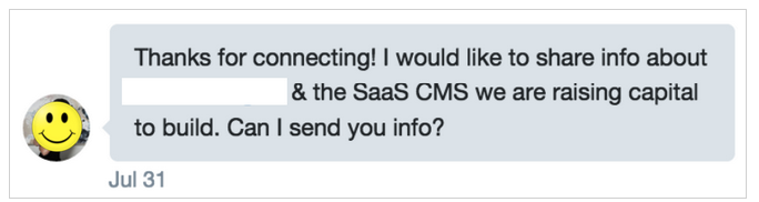 (上圖:某個(gè)菜鳥(niǎo)創(chuàng)始人回復(fù)投資人說(shuō),感謝與我聯(lián)系,我想和您分享一些公司產(chǎn)品信息,希望能募集資金去開(kāi)發(fā)SaaS CMS產(chǎn)品,我能給你發(fā)送些相關(guān)資料嗎?)