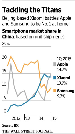 (圖上文字:與巨頭的較量:北京企業(yè)小米公司擊敗蘋(píng)果三星在中國(guó)市場(chǎng)獨(dú)占鰲頭。中國(guó)智能手機(jī)市場(chǎng)份額(出貨量)《華爾街日?qǐng)?bào)》)
