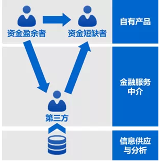 看到上圖可能有些讀者會疑問:傳統(tǒng)金融機(jī)構(gòu)是不是屬于上圖中的第三方?針對這個問題,我進(jìn)一步解釋一下第三方在投融資流程中的角色。第三方并不吸收資金或出借資金,而是僅作為媒人,撮合投融資雙方,投融資雙方是一一對應(yīng)的。從這個角度來說,擁有資金池的所謂P2P借貸平臺其實(shí)不是第三方,而是資金盈余者或短缺者。傳統(tǒng)機(jī)構(gòu)也有可能是第三方:以銀行代銷基金產(chǎn)品為例,基金公司是資金短缺方,零售投資者是資金盈余方,銀行則是第三方。用金融行內(nèi)的術(shù)語來講,第三方只是一個“通道”。弄清楚了投融資的流程,下面我們要介紹的是:投融資領(lǐng)域的三種業(yè)務(wù)模式
