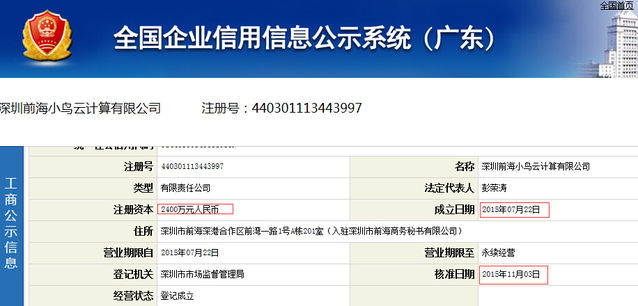 公開資料顯示,小鳥云是深圳前海小鳥云計算有限公司旗下云計算服務(wù)品牌,專注于云計算技術(shù)研發(fā)與創(chuàng)新。公司成立于2015年7月22日,注冊資金2400萬人民幣,工商核準(zhǔn)日期為2015年11月3日。